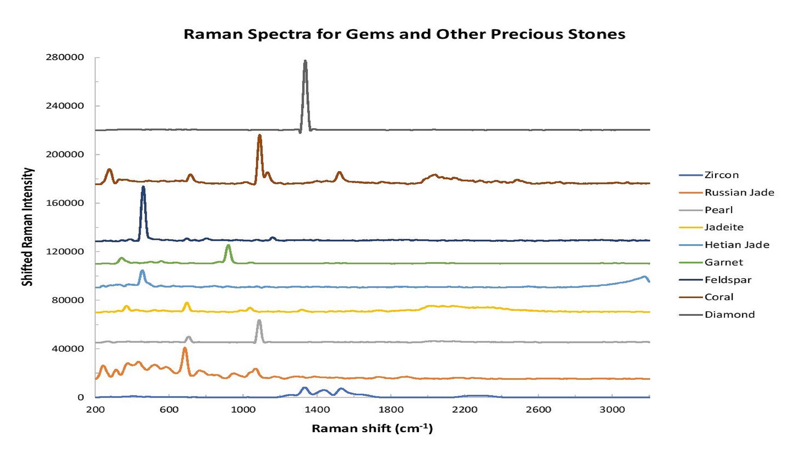 For example, Raman spectroscopy can explore the molecular structure of the gemstone. The spectral fingerprints provided by Raman spectroscopy contain peaks that can be tied to a gemstone’s chemical structure, as well as the trace minerals and inclusions that give stones such as emerald and ruby their distinctive hues (Figure 1).