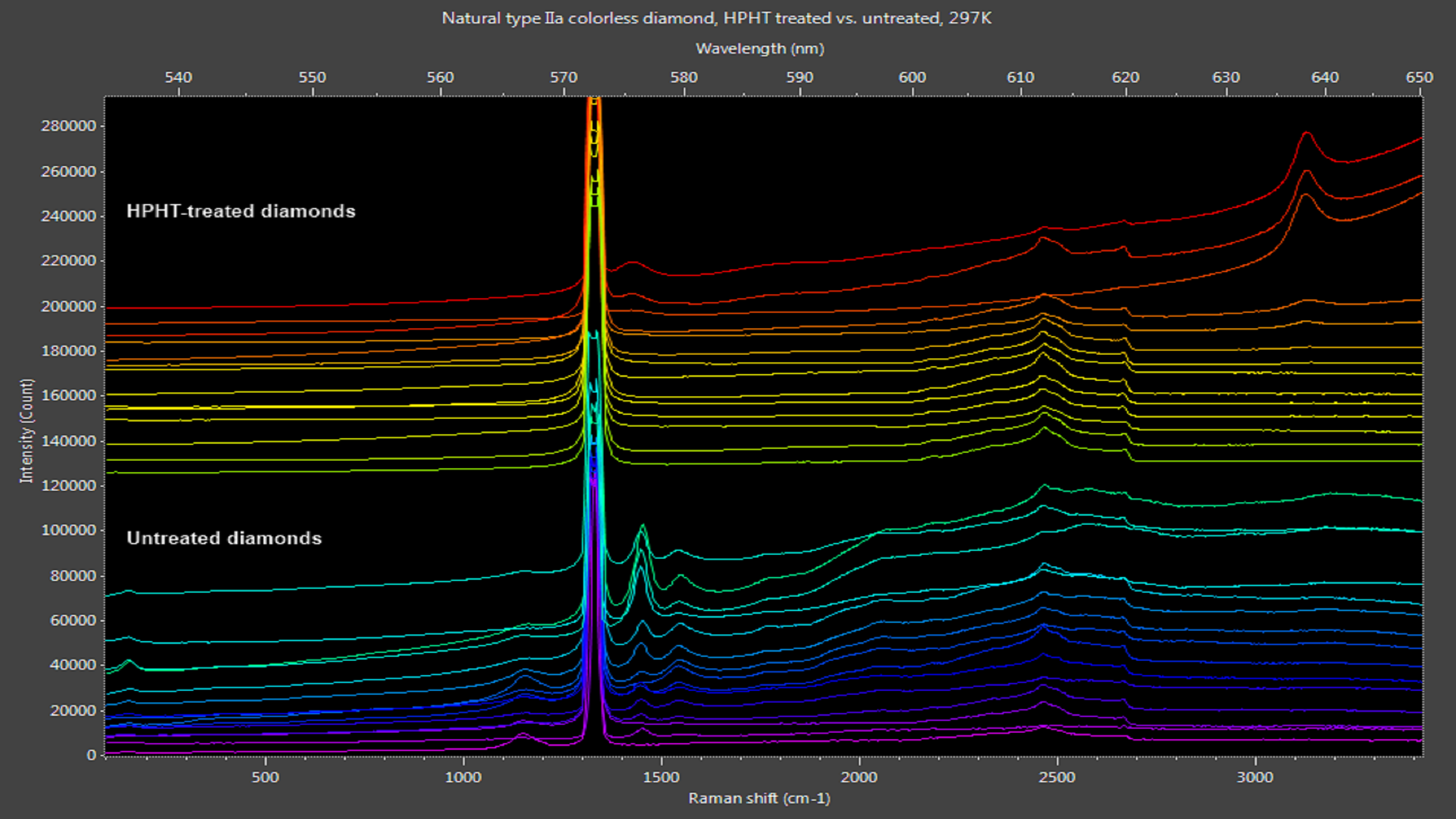 Figure 2: Naturally clear diamonds exhibit photoluminescence peaks from 530-600 nm. HPHT treatment removes most of these peaks, leaving only nitrogen-vacancy peaks at 576 nm and 637 nm in some samples.