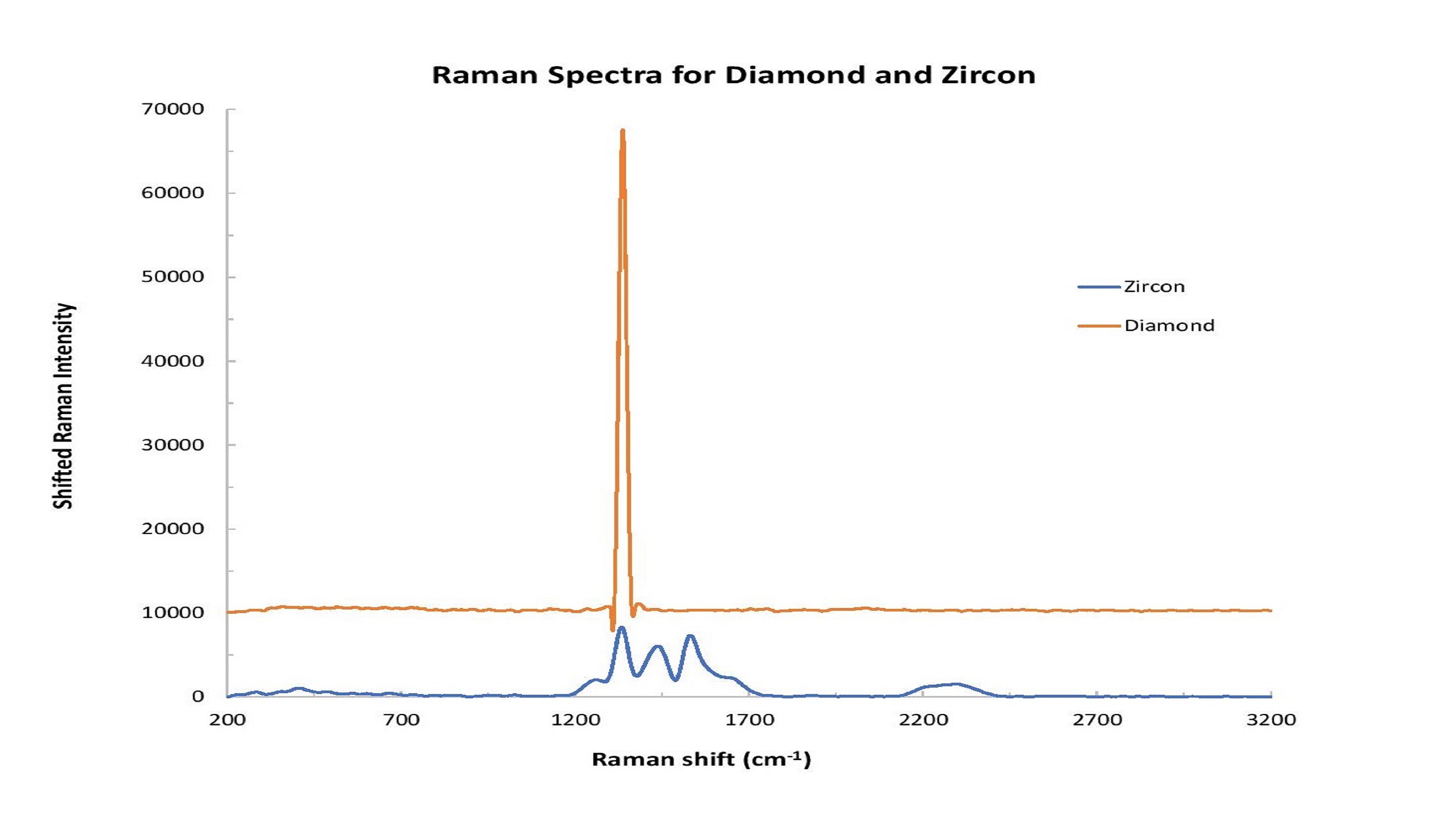 Zircon is another natural gemstone that can be heated to make it colorless and more closely resemble diamond. (Zircon should not be confused with cubic zirconia, an inexpensive synthetic gemstone that’s very popular as a diamond simulant.) Raman analysis of zircon and diamond can be applied to reveal different spectral characteristics for each (Figure 3).