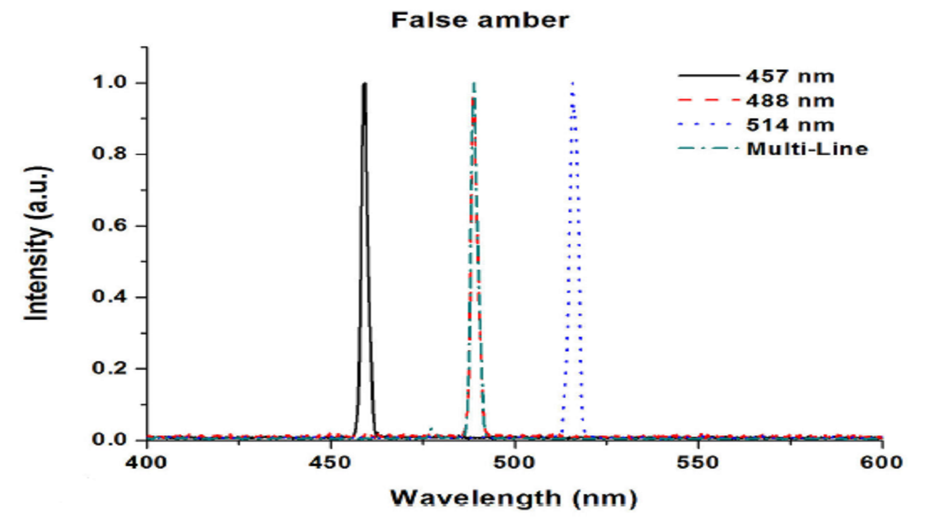 In a 2014 paper, investigators at the Centro de Investigaciones en Óptica, A. C. in León, Mexico compared false amber to specimens from the Baltic and Chiapas regions, observing fluorescence excited with a tunable Argon-ion laser at 457 nm, 488 nm, 514 nm and multi-line outputs2.