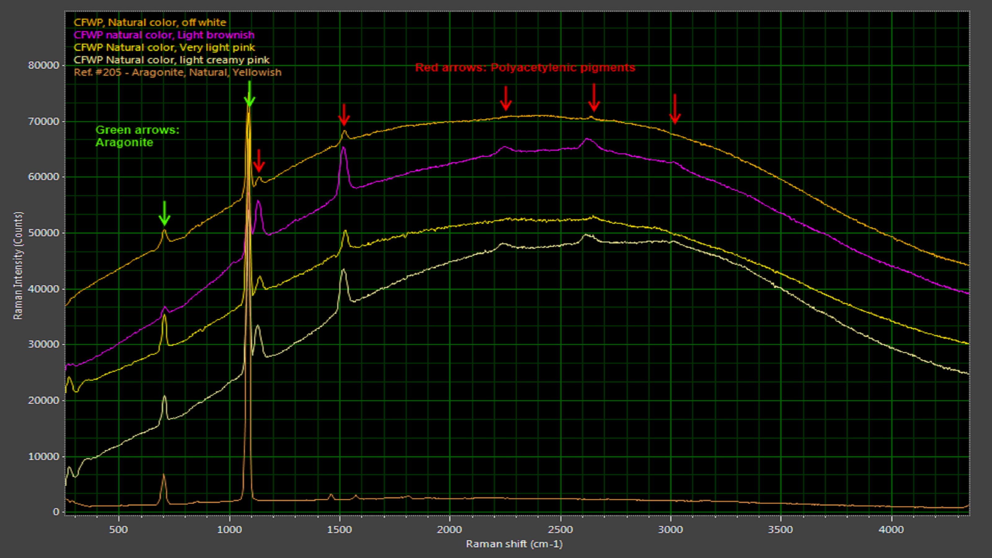 Figure 5: Natural freshwater pearls have characteristic Raman peaks associated with aragonite, a carbonate mineral.