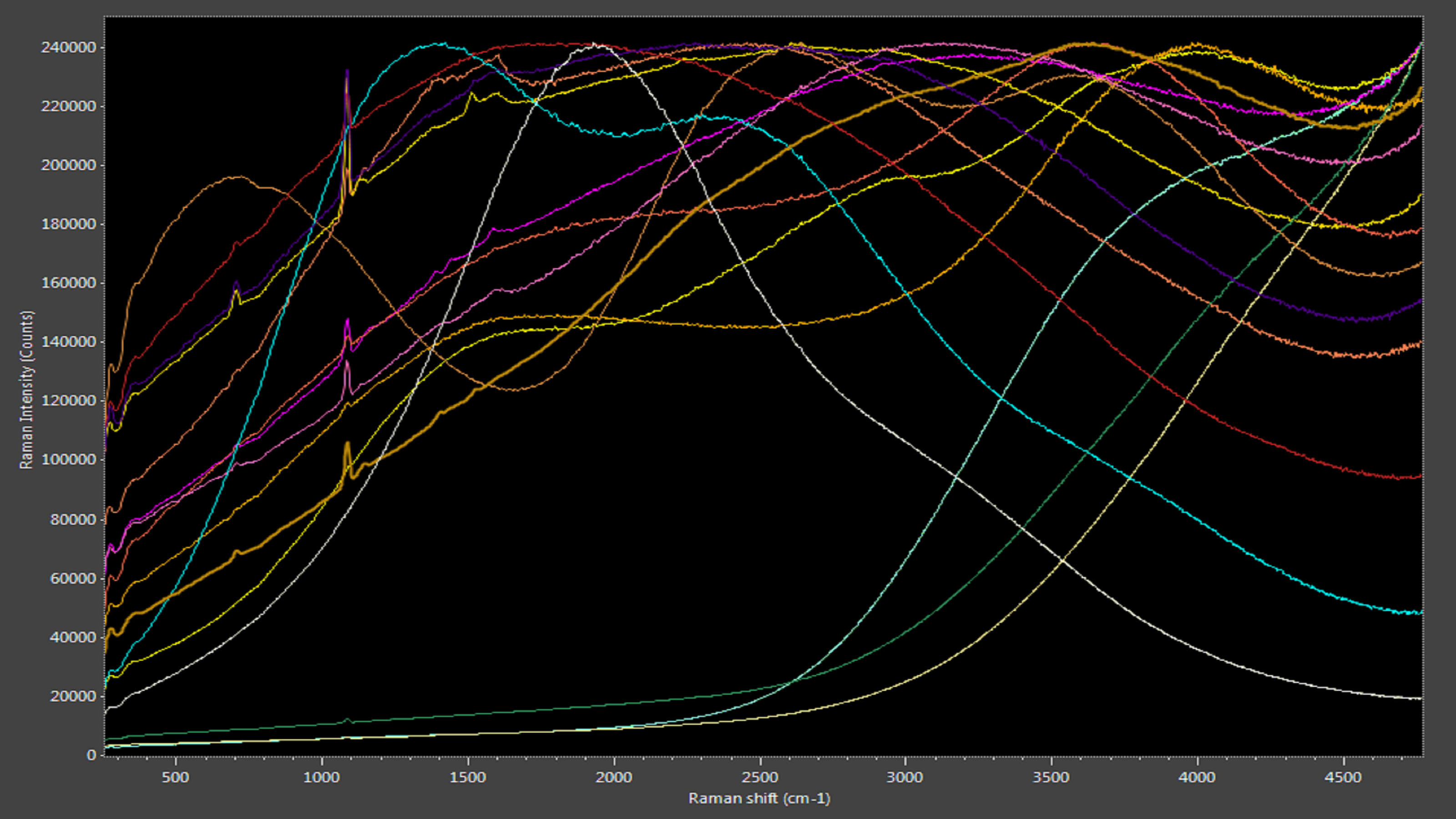 Naturally colored coral has distinctive Raman peaks on a characteristic photoluminescence background. These peaks indicate forms of calcium carbonate, as well as the polyacetylenes and carotenoids that imbue coral with such beautiful color. When dyed coral is subjected to the same measurement, a much broader photoluminescence curve is seen (Figure 7). This curve is centered at a different wavelength and lacks Raman peaks.