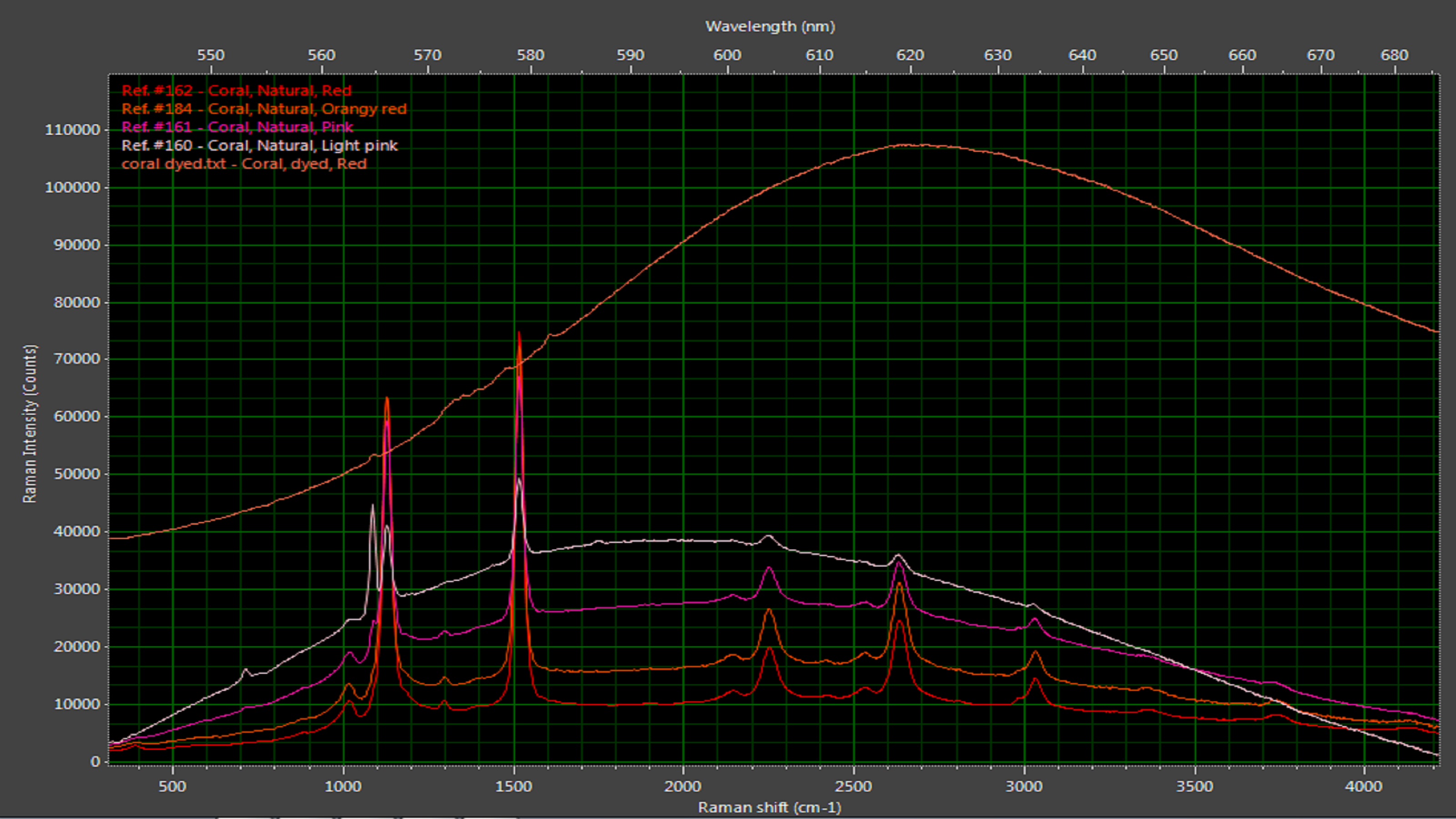 图7:与与天然珊瑚相关的更明显的拉曼峰相比,染色的珊瑚曲线表现出广泛的发光曲线。