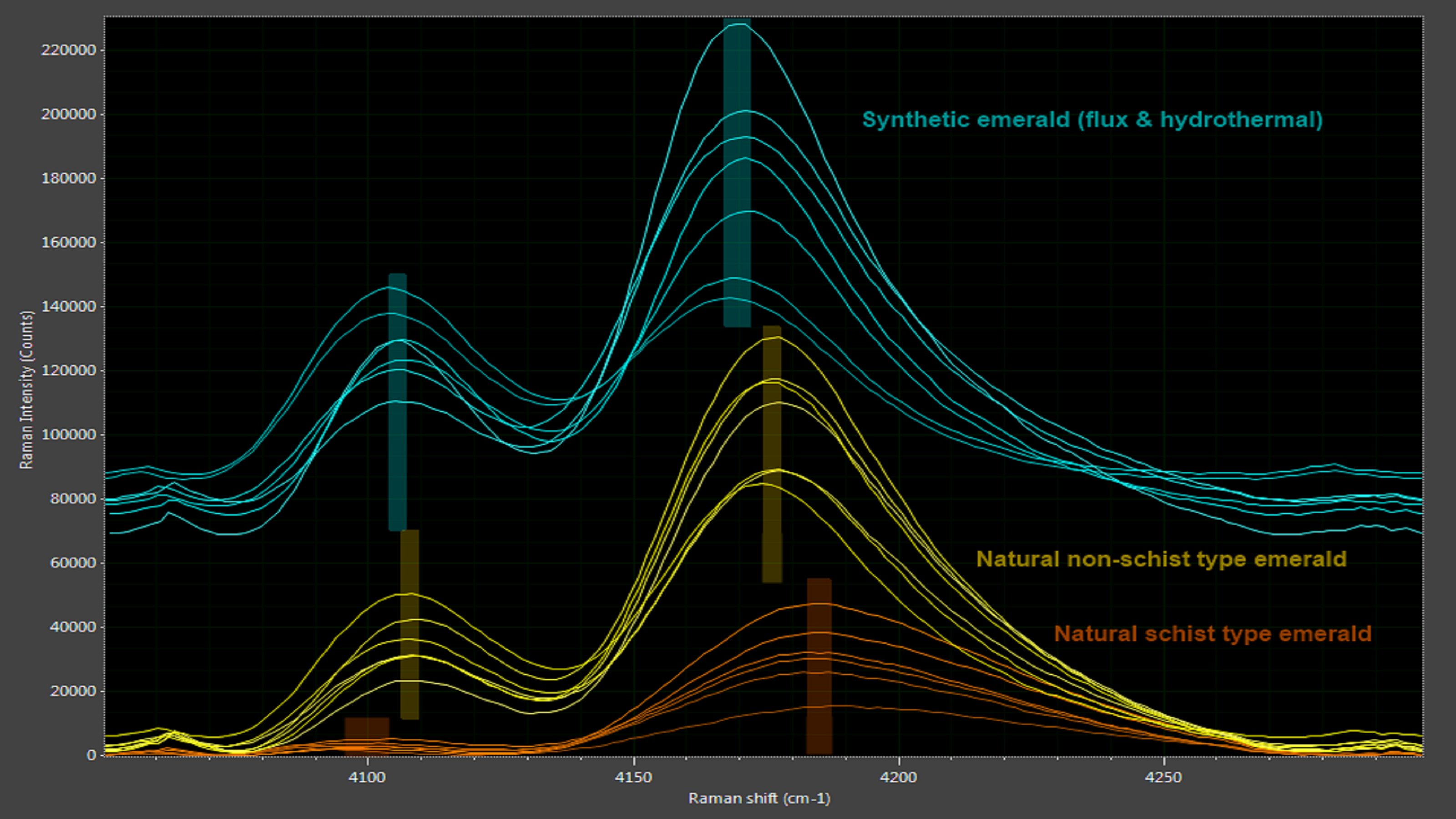 Figure 8: Subtle differences between authentic and synthetic emeralds are revealed in spectral analysis.