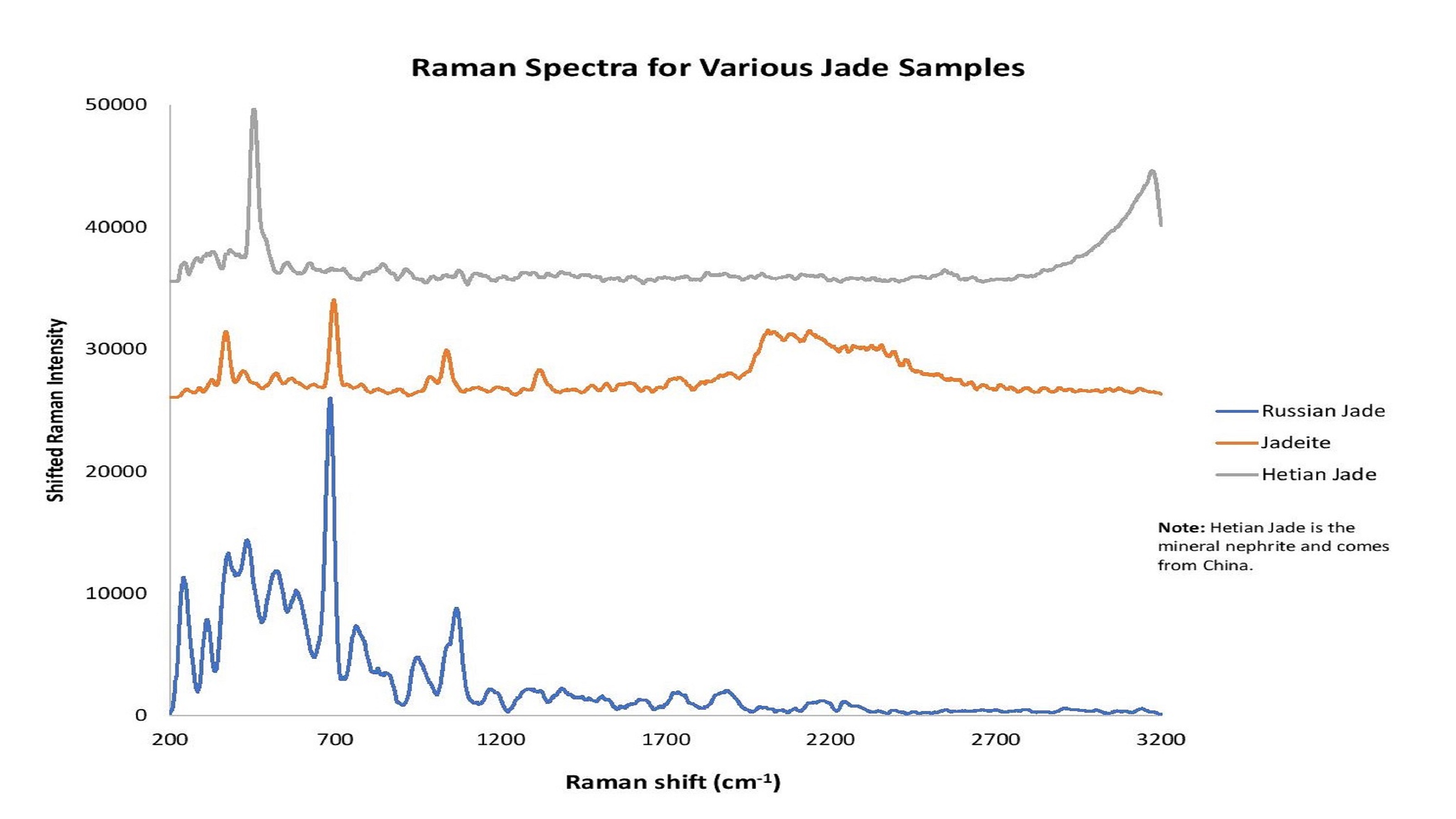 Figure 9: The word "jade" describes the minerals jadeite or nephrite. Raman spectroscopy helps to reveals differences in jade types and point of original.